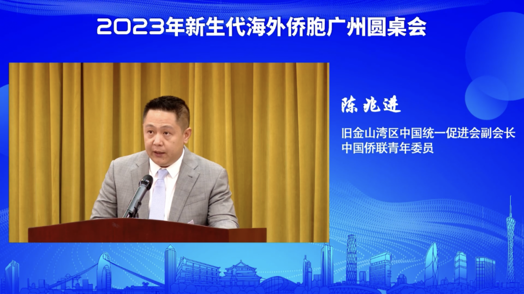 我是陈兆进,广东广州本地人,旧金山湾区的侨界人士。目前主要在广州和美国两地做贸易、投资、企业落户政策咨询以及相关服务。非常荣幸能参加此次新生代海外侨胞广州圆桌会,在这里和大家一起交流分享我的一些感悟和体会。 从19岁开始,我陆续参加了一系列的侨界爱国活动。很幸运一直以来受到爱国侨领以及国内外相关部门的支持,让我不断适应新形势、挑战新任务,为促进中外经济交流合作,做好对外传播工作,为祖国发展繁荣贡献力量。在此,对国内外相关部门、爱国侨领以及各侨团的支持,我深表感谢。 作为一名爱国侨胞,下面,我将从两个方面——侨胞融通能力和三跨优势,浅谈几点感悟,与大家共同交流。 海外侨胞人数众多,网络资源丰富,可灵活对接各类中外资源。所以我们可以充分发挥全球性、跨国性、灵活性的华商网络优势,在中国和外国之间的产业对接、资本对接、网络对接、技术对接以及市场对接等层面牵线搭桥,带动华侨华人经济和“一带一路”倡议互动建设,实现多方共同发展。 侨胞最为独特的优势就是“跨国界、跨地域、跨语言”。侨胞了解中外文化、社会、法律制度等方面的差异,懂得相关政策的优势,可以充当“宣传大使”的角色,在海外讲好中国故事。凭借侨胞朋友们广泛的人脉资源、丰富的商业经验,能够让世界了解真实的中国,了解粤港澳大湾区经济发展方向,甚至能够解读政策优势,推动招商引资。 长期以来,一代又一代海外侨胞,秉承中华民族优秀传统,热情支持中国革命、建设、改革事业。粤港澳大湾区的华人华侨更是不断加强与内地联系,为助力海外乡亲投资兴业提供重大平台及咨询服务。未来,希望更多的海外侨胞能携起手来,进一步凝聚侨心、汇集侨智、发挥侨力、共同团结奋斗,一起助力祖国发展!