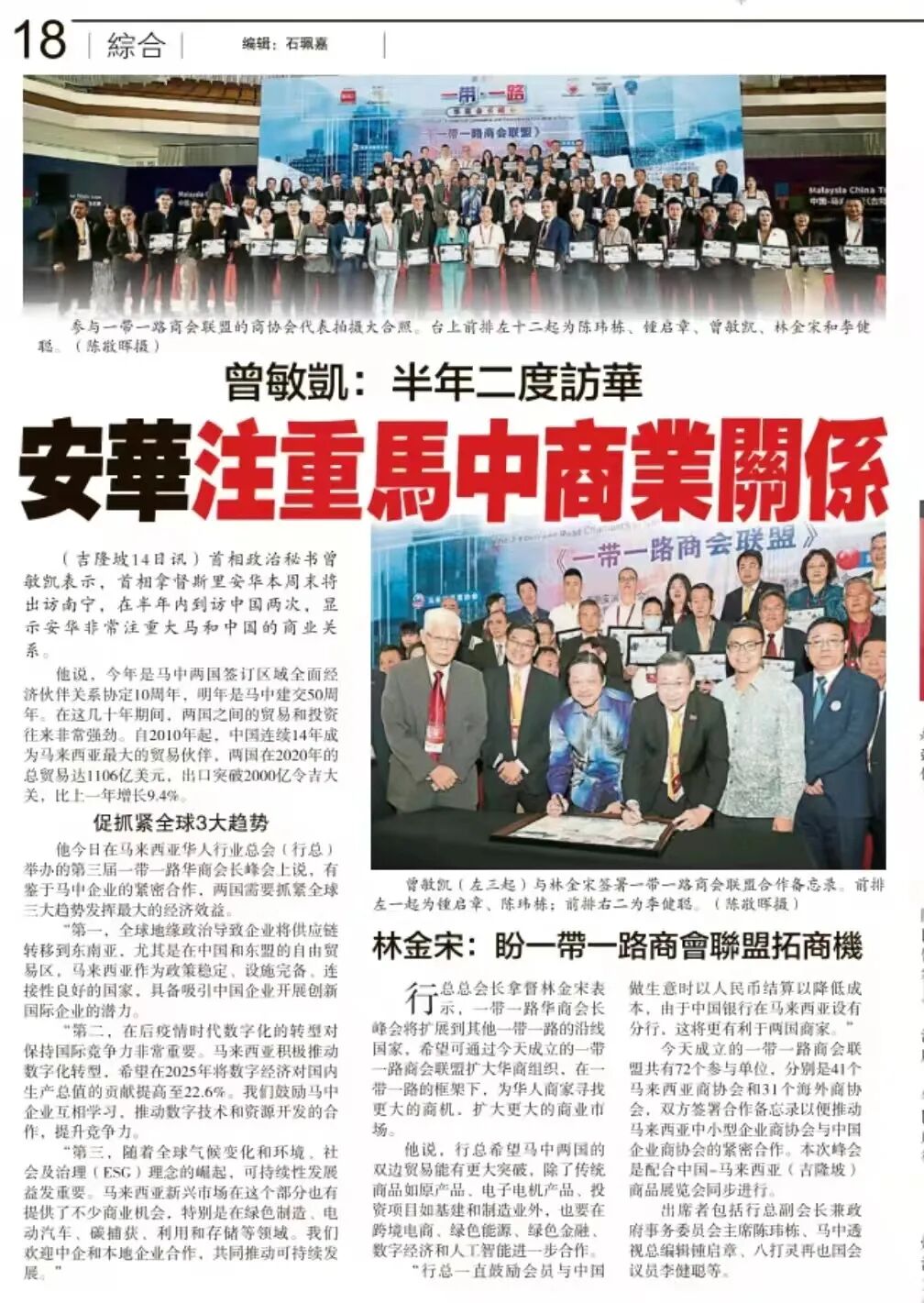 9月14日,一带一路商会联盟在马来西亚吉隆坡成立,共有72 个来自中国、马来西亚以及东盟国家的各行业商协会参与,共同签署合作备忘录以便推动马来西亚中小型企业商协会与中国企业商协会的紧密合作。本次峰会配合中国-马来西亚(吉隆坡 )商品展览会同步进行。 马来西亚华人行业总会(行总)会长拿督林金宋表示,一带一路华商会长峰会将扩展到其他“一带一路”的沿线国家,希望可通过今天成立的一带一路商会联盟扩大华商组织,在“一带一路”的框架下,为华人商家寻找更大的商机、扩大更大的商业市场。 他说,行总希望马中两国的双边贸易能有更大突破,除了传统商品如原产品、电子电机产品、投资项目如基建和制造业外,也要在跨境电商、绿色能源、绿色金融、数字经济和人工智能进一步合作。 “行总一直鼓励会员与中国做生意时以人民币结算以降低成本,由于中国银行在马来西亚设有分行,这将更有利于两国商家。”