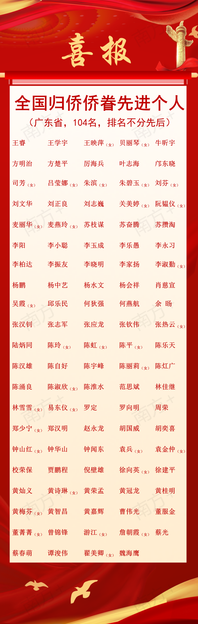 侨联四海,同心筑梦。8月31日,备受广大归侨侨眷和海外侨胞瞩目的第十一次全国归侨侨眷代表大会在北京开幕。 会上宣读了《中国侨联、国务院侨办关于表彰中国侨界杰出人物和全国归侨侨眷先进个人的决定》《人力资源社会保障部、中国侨联关于表彰全国侨联系统先进集体和先进工作者的决定》《中国侨联关于表彰全国侨联系统先进组织和先进个人的决定》,并为获奖单位和个人颁奖。 其中,广东省有104人荣获全国归侨侨眷先进个人殊荣。 厉海兵、肖慈宣、张热云、陈平、陈淑欣、罗向明、周荣、黄梅芬、杨鹏、朱滨、倪壁雄等11名广东致公党员获得此项殊荣。